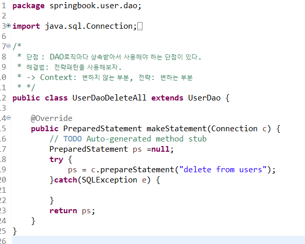 결국 이구조에서 전략 오브젝트를 생성하고 컨텍스트로 전달 하는 것은 Object Factoty(client)이며, 이것이 바로 의존관계 주입(DI)에 해당된다. 이제 이패턴을 적용시켜보자. 아래 코드를 다시 살펴보면 try/catch/finally 부분이 context에 해당되며 StatementStrategy strategy= new DeleteAllStatement(); 이부분이 전략에 해당된다.