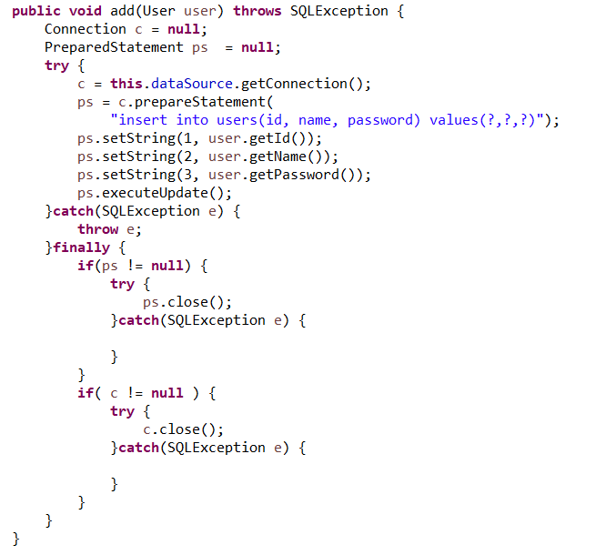 - 모든 경우에 만들어진 PreparedStatement와 Connection을 적절히 닫아주기