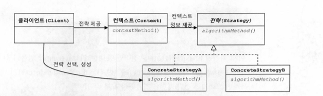 전략패턴에 따르면 컨텍스트가 어떤 전략을 사용할지는 클라인트가 결정하는게 일반적이다. 클라이언트가 구체적인 전략 하나를 오브젝트로 만들어 컨텍스트에 전달해준다. 그러면 컨텍스트는 전달받은 오브젝트를 사용하게된다. 이를 표현 한것이 아래 그림이다.