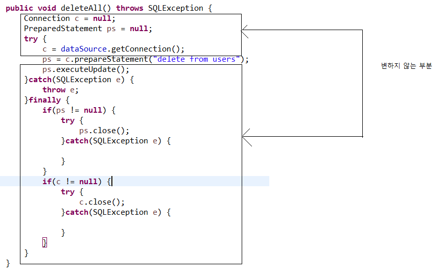 - DAO 메소드마다 새로운 StaementStrategy 구현 클래스를 만들어야 하는점