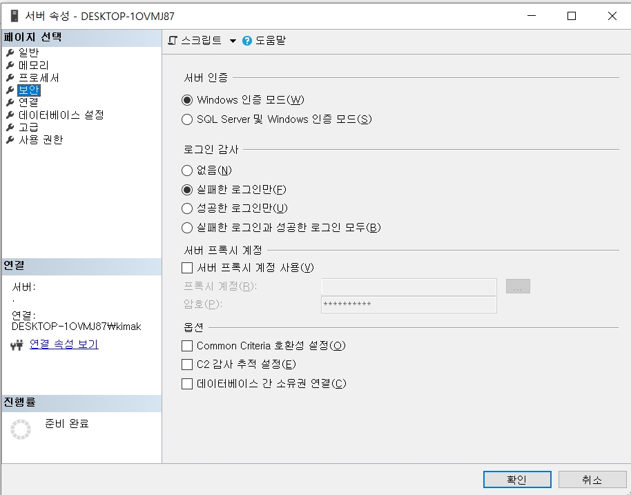 8. 서버 오른쪽 마우스 클릭후 속성을 선택한다. 서버인증및 로그인 감사를 보안요구 사항에 맞게 수정한다.
