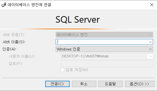 7. 서버이름에는 local일 경우 . 만 입력후 연결을 누르면 된다.