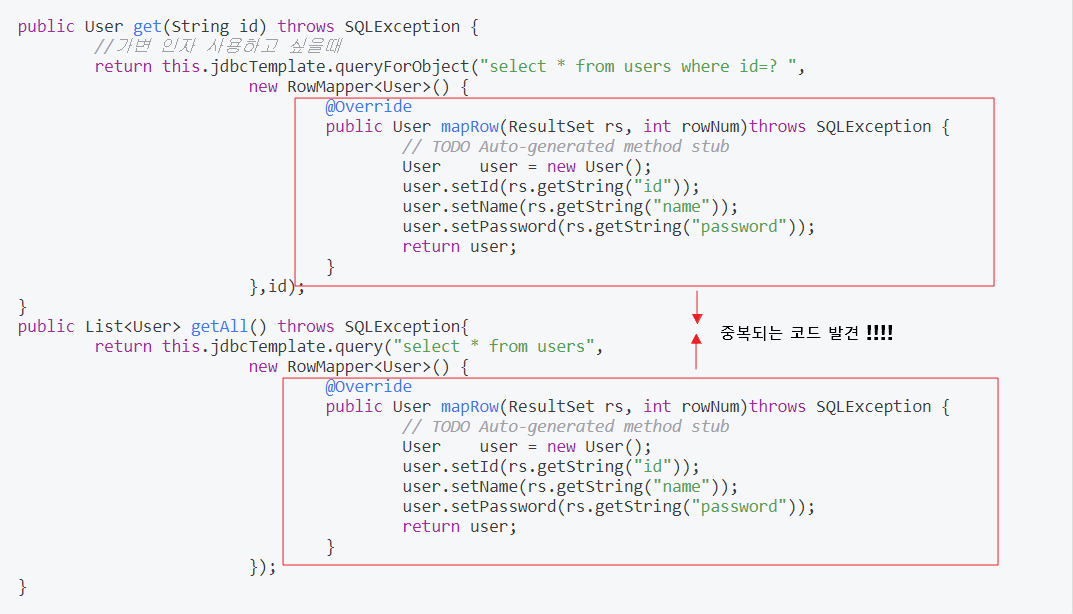 하기 코드에서 보면 알수있듯이 get() , getAll() 함수에서 RowMapper가 중복됨을 확인했다. 중복되는 코드를 다시 분리시켜 보자.